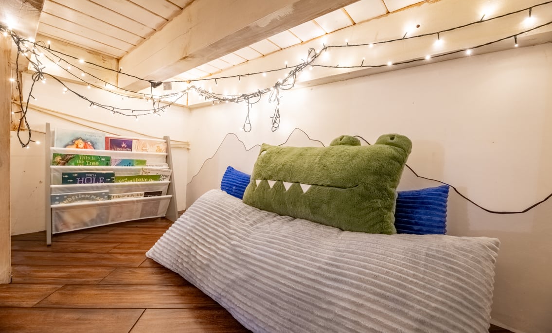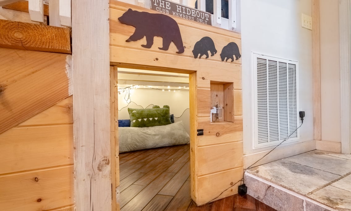 Just behind the staircase, you’ll find a kids’ crawl-space play area — a fun little hideaway they’ll claim as their own. On the staircase’s middle landing, a desk offers a dedicated spot to check emails or jot down tomorrow’s plans. Overall, it’s a great space to gather everyone, hang out, and take it easy for a spell after a day of hiking in the Smokies, fly fishing with friends, or shopping downtown.