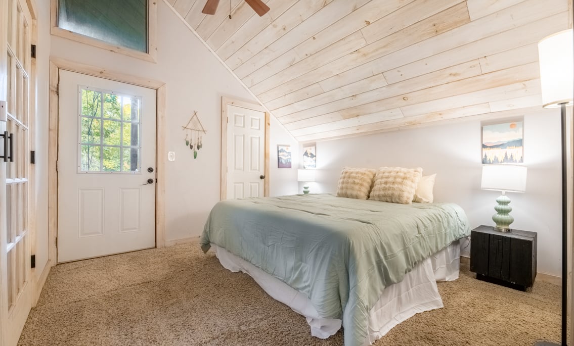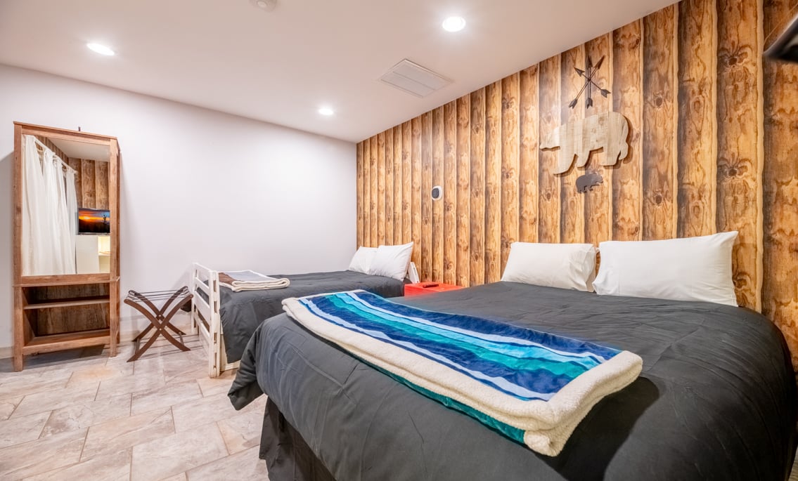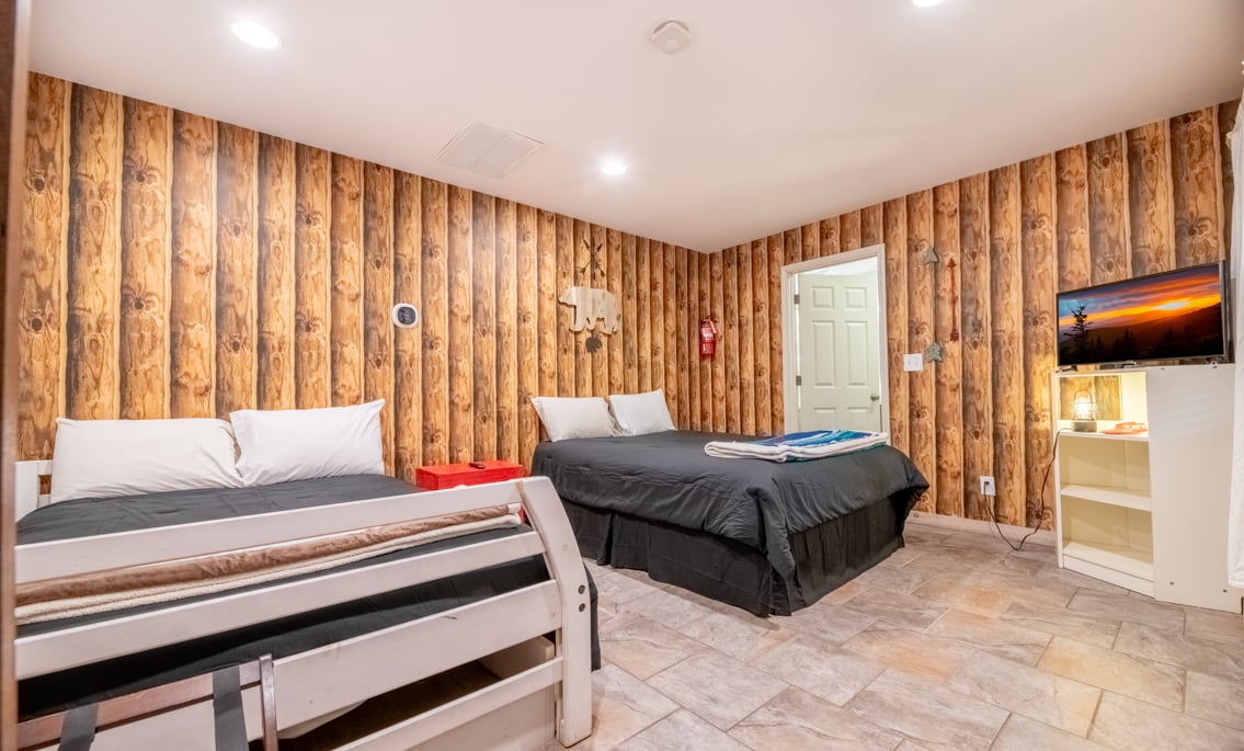 On the lower level, accessible via a spiral staircase, you’ll find a spacious bedroom with 2 full beds, each with a twin trundle underneath. This room has its own private bathroom with a walk-in shower and direct access to the outdoor patio and hot tub area — a quiet, tucked-away retreat that still feels connected to the rest of the home.