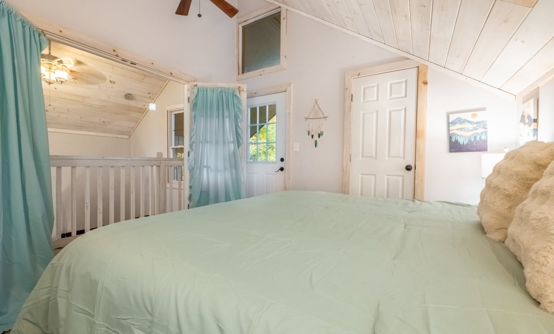 With 3 bedrooms, a futon in the loft, and 2½ bathrooms, your Smoky Mountain cabin comfortably sleeps up to 11 guests. Upstairs, the primary bedroom with a king-size bed opens to a spacious private balcony with treetop views, a bench, and a quaint table — perfect for sunrise coffee or stargazing at night. This room also connects to a bathroom with a shower/tub combo and features glass doors that lead to a loft-style overlook above the main living space.