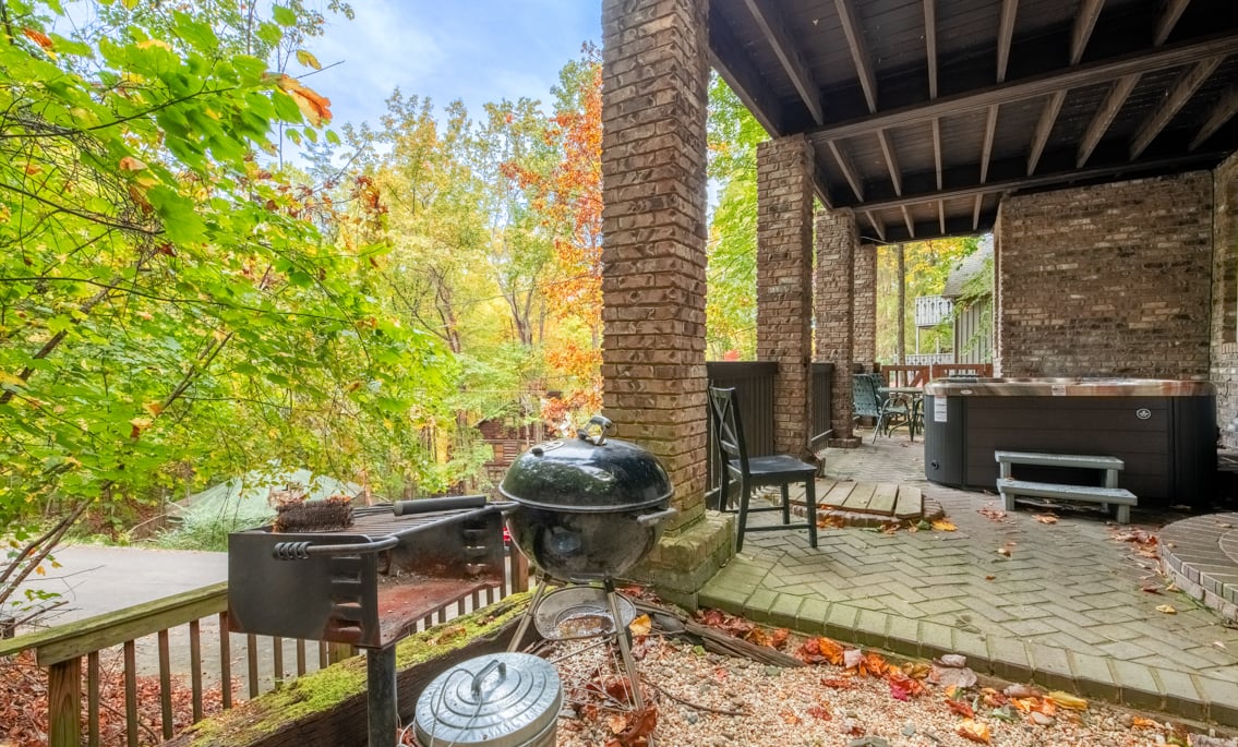 Down below, the patio offers a bubbling hot tub for soothing soaks anytime of year, a small bistro table to sip and chat, and 2 charcoal grills (one picnic style) so you can cook out your way. Whether you're soaking, sipping, or just taking in the wooded views, every outdoor space feels like an extension of this rental cabin’s comfort and calm. It’s perfect for family vacations or weekend get-togethers with friends!