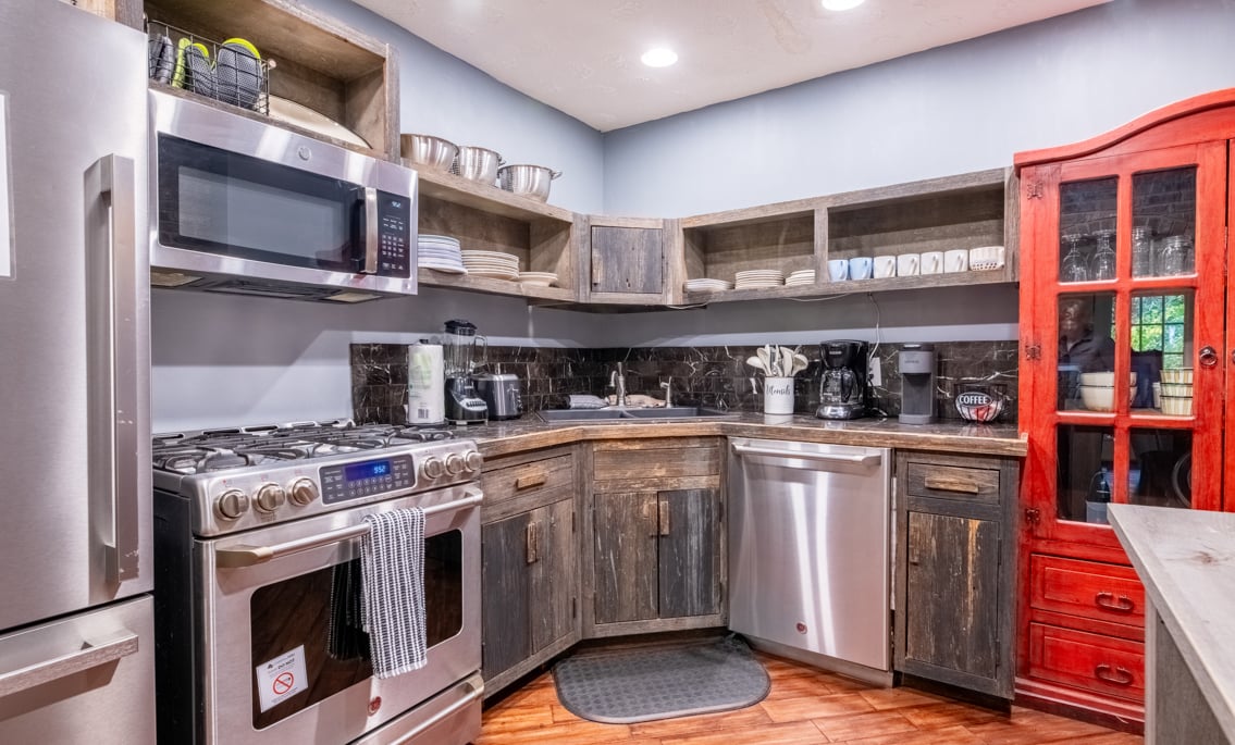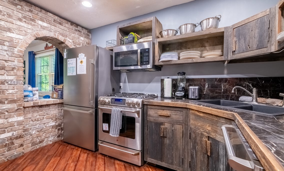 Through brick archways, the fully equipped kitchen at your mountain vacation home combines rustic charm with modern convenience. Stainless steel appliances, provided tools, and a central island with seating make cooking a breeze, whether you're prepping pancake breakfasts or steaks to pair with mountain air.