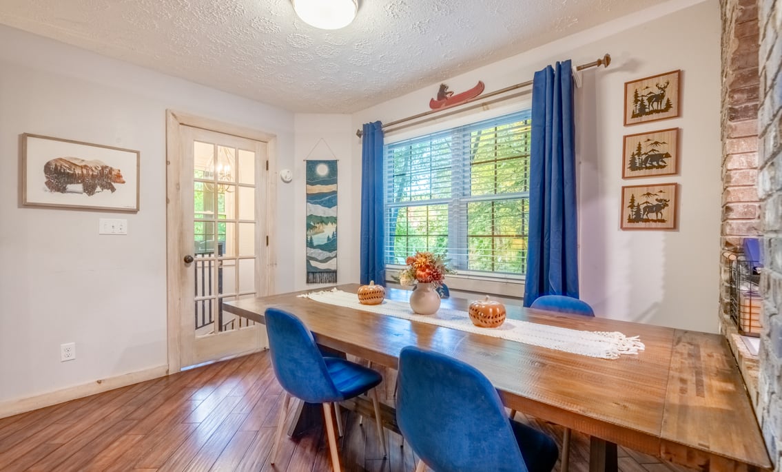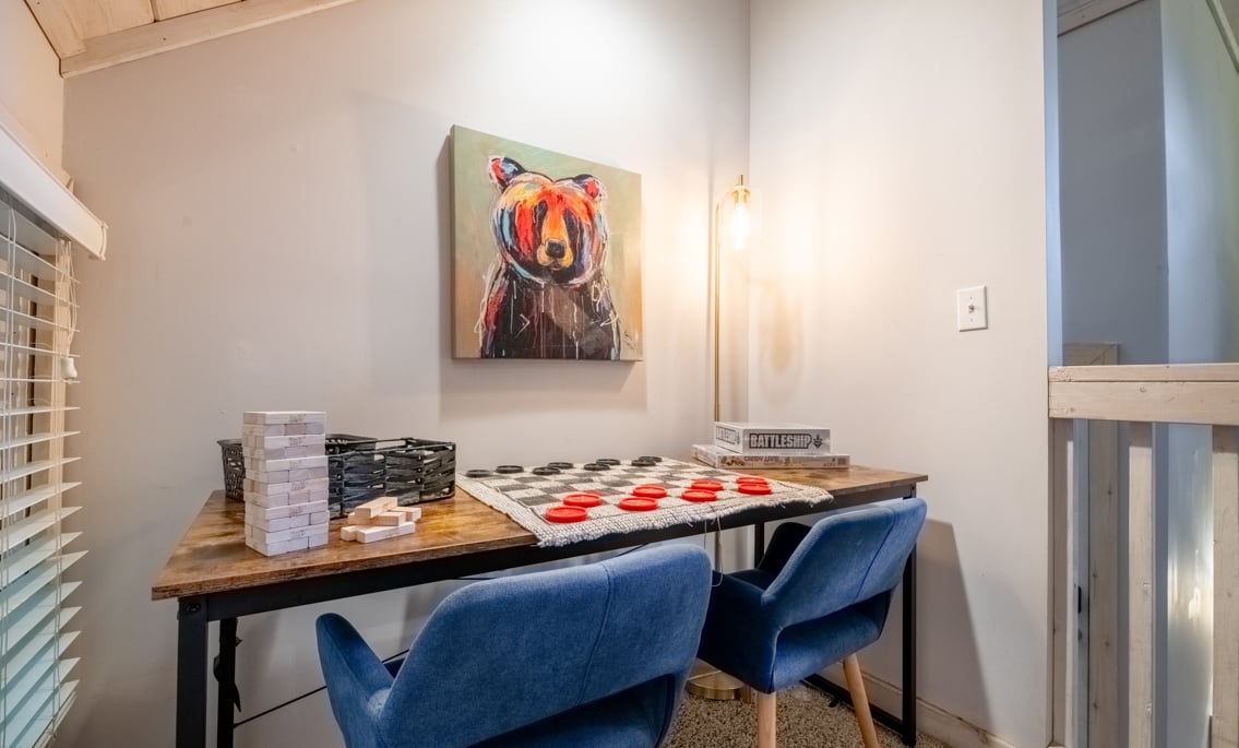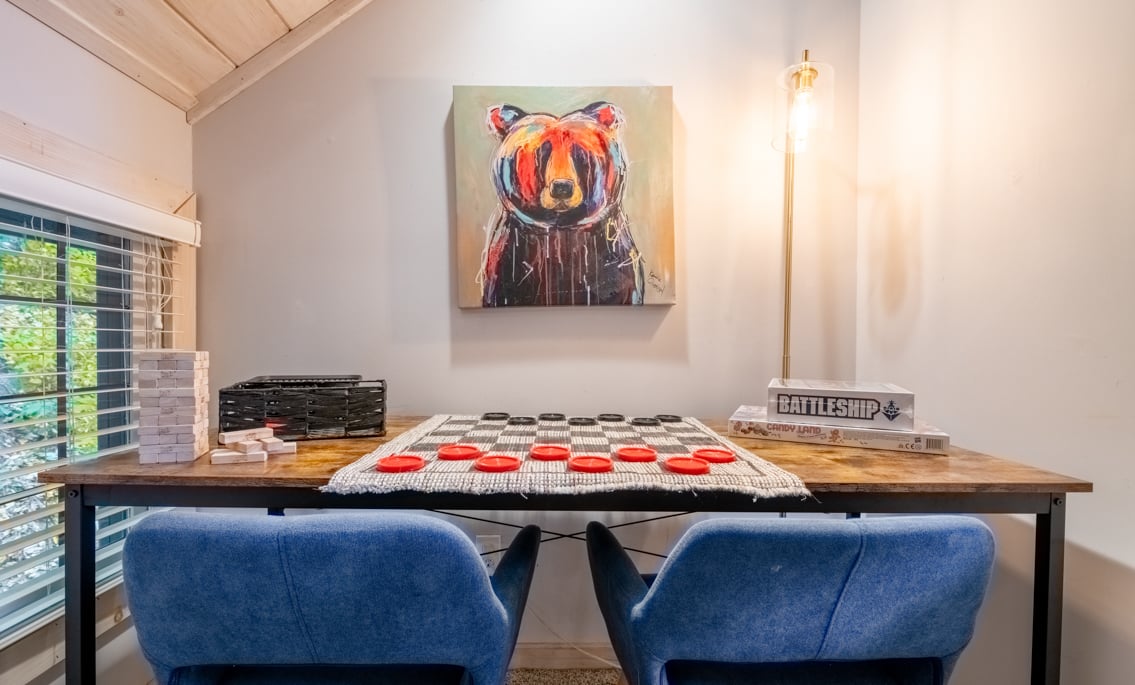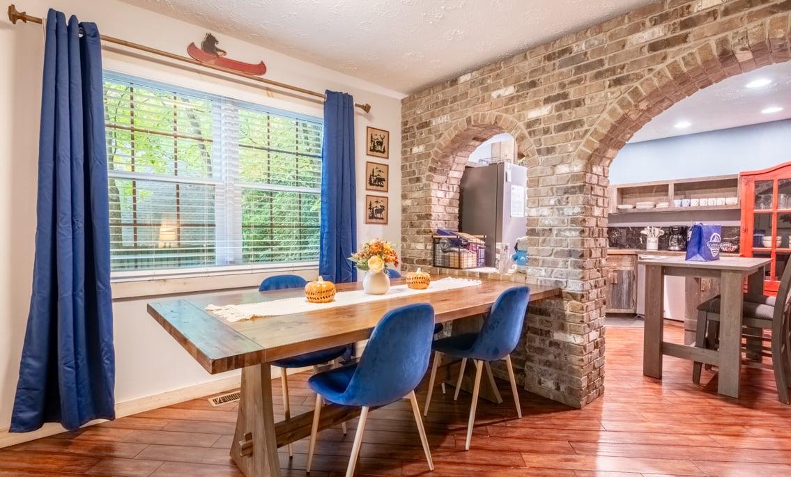 The dining space flows seamlessly from the kitchen, creating a social hub for meals, games, and late-night snacks. Set the table for homemade dinners, Appalachian barbecue takeout, or dessert with coffee; there’s also additional seating at the island. With board games tucked nearby and sightlines to the living room, it’s the kind of shared space where conversations linger and good memories stack up at your charming vacation rental.