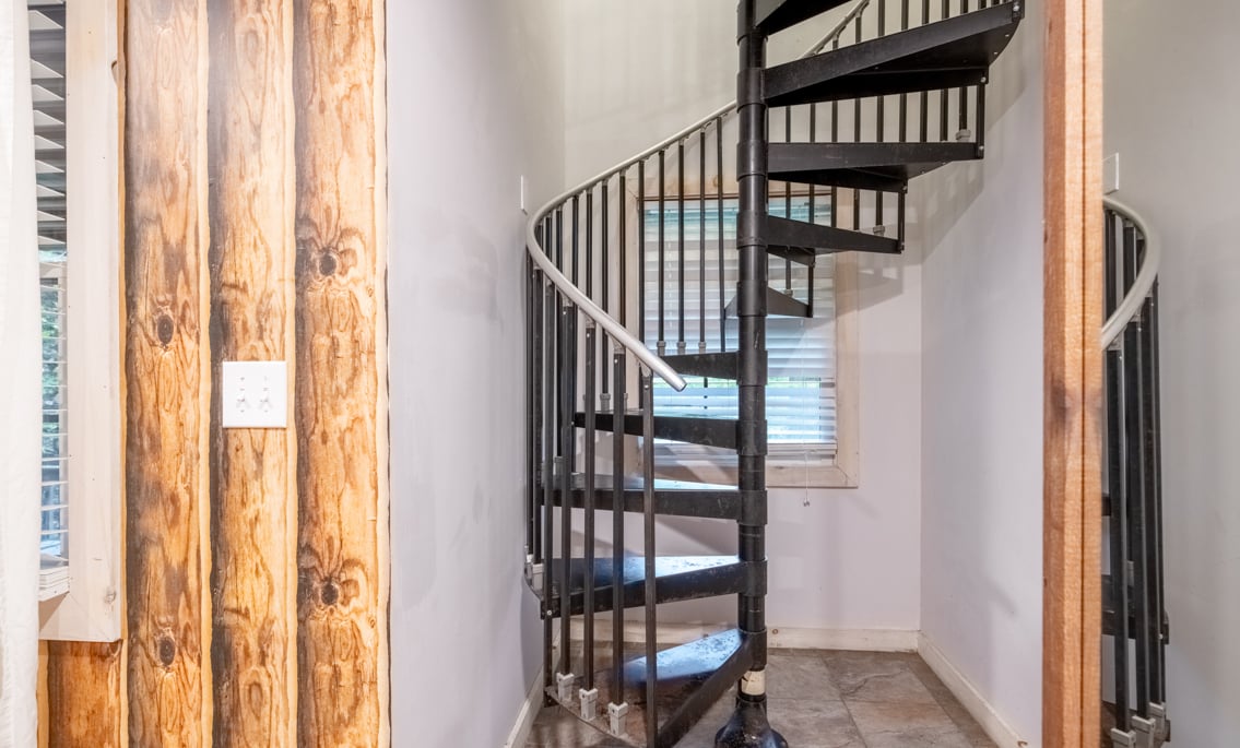 A metal spiral staircase leads down to the final bedroom; this is the only way to reach this space from the inside. Entering from the lower-level patio outside and through the second bathroom is another option.